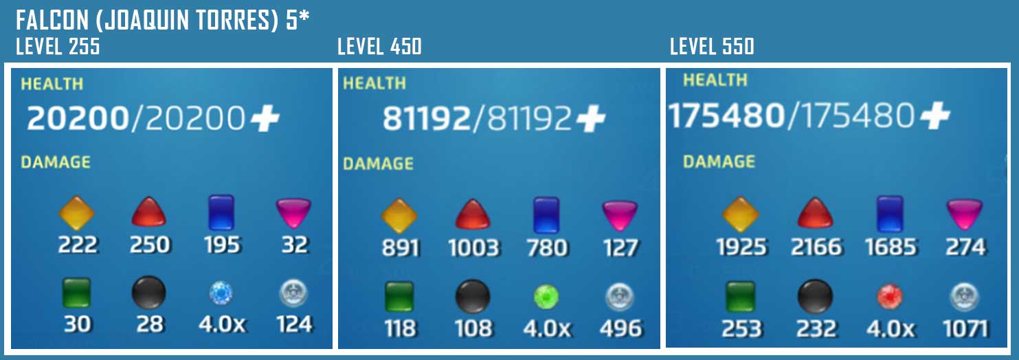 (PASSIVE) If Falcon is Airborne at the start of his turn, increase the damage of this ability by 177. At the end of Falcon’s turn, if any friendly or enemy Strike, Attack, or Protect tiles had their strength changed this turn, increase the damage of this ability by 354.